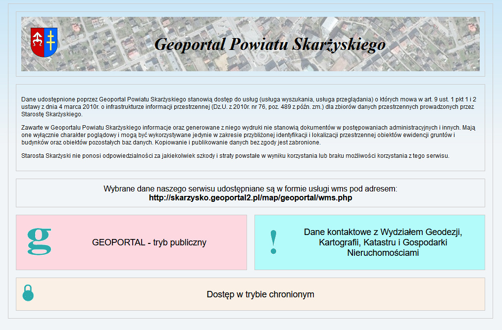 Powiat skarżyski zaprasza mieszkańców, przedsiębiorców, wykonawców prac geodezyjnych, projektantów, inwestorów oraz inne zainteresowane podmioty do korzystania z nowo utworzonego Geoportalu Powiatu Skarżyskiego, czyli strony internetowej świadczącej usługi przeglądania danych przestrzennych. Geoportal ten umożliwia w szczególności powszechny i nieodpłatny dostęp do usług wyszukiwania i przeglądania danych przestrzennych powiatowego zasobu geodezyjnego i kartograficznego z terenu powiatu skarżyskiego, a także dostęp w trybie chronionym czyli niepublicznym do usług sieciowych oraz materiałów zasobu w postaci dokumentów elektronicznych.