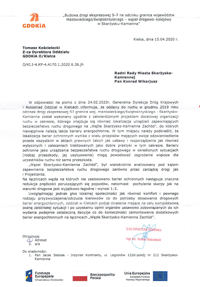 Na problem - w sposób formalny (w formie pisemnego wniosku do GDDKiA) postanowili zwrócić uwagę również radni miejscy - Konrad Wikarjusz i Mariusz Bodo. Radni wystosowali do Dyrektora Oddziału w Kielcach Generalnej Dyrekcji Dróg Krajowych i Autostrad Krzysztofa Strzelczyka pismo, w którym opisali sytuację i zaapelowali do dyrektora o pilną weryfikację przyjętych założeń dot. rozmieszczenia drogowych barier ochronnych (ew. montaż brakujących barier) i ponowne wykonanie audytu bezpieczeństwa problematycznego fragmentu drogi.