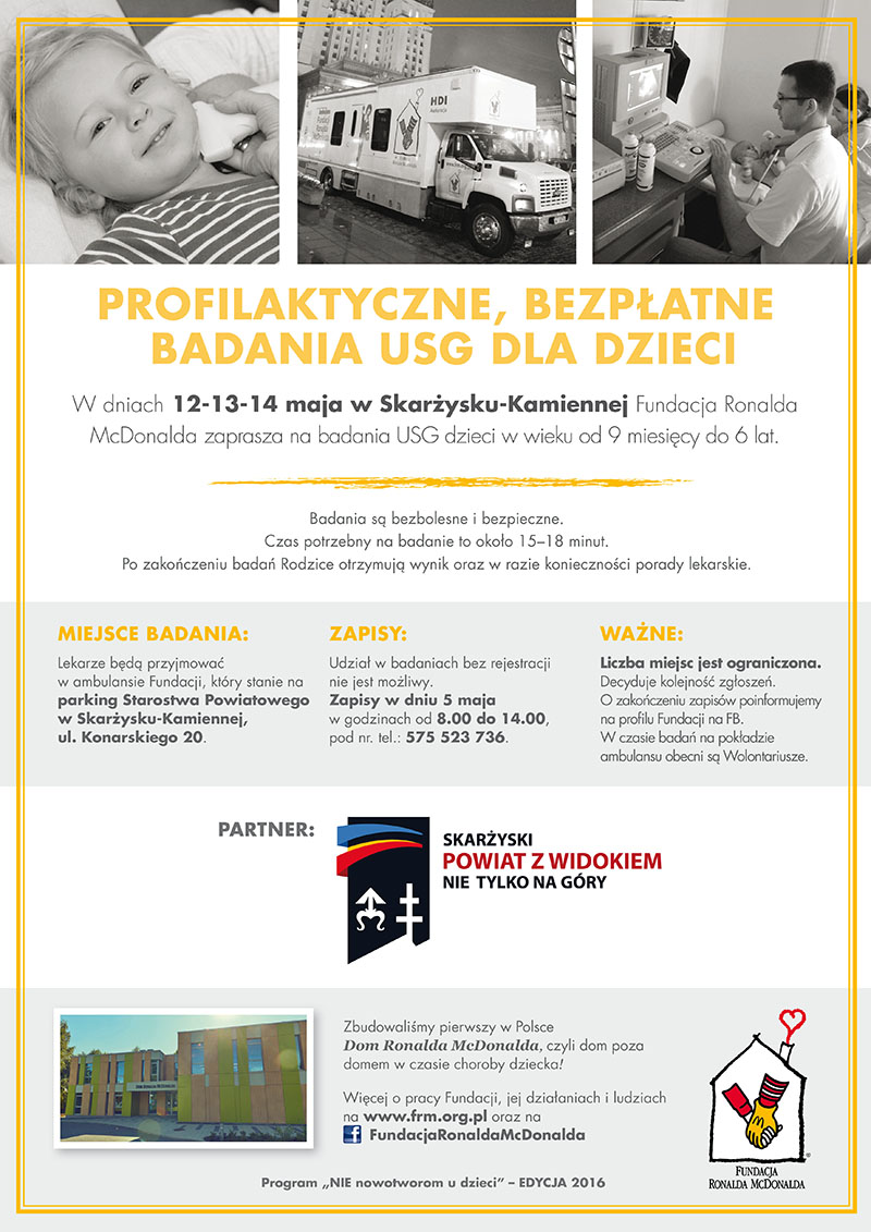 Badania przeprowadzane będą przez zespół lekarzy w specjalistycznym ambulansie medycznym Fundacji Ronalda McDonalda, który stacjonować będzie na parkingu Starostwa Powiatowego w Skarżysku-Kamiennej przy ul. Konarskiego 20 w dniach 12, 13 i 14 maja w godzinach od 9.00 do 18.00.