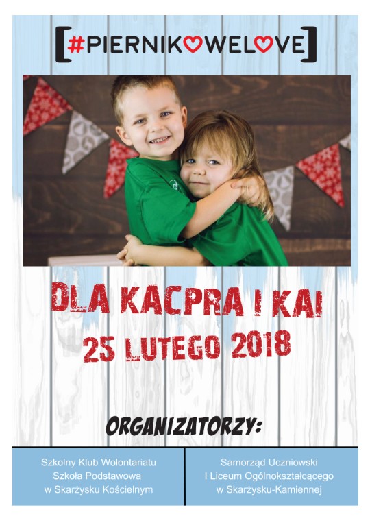 25 lutego 2018r. przy Parafii Św. Trójcy w Skarżysku Kościelnym i 4 marca 2018r. przy Parafii Niepokalanego Poczęcia NMP w Skarżysku-Kamiennej, wolontariusze będą sprzedawać własnoręcznie upieczone serca z piernika. Dochód z akcji przeznaczony będzie na rehabilitację i leczenie Skarżyszczan - czteroletniego Kacpra i dwuletniej Kai Pisarków.