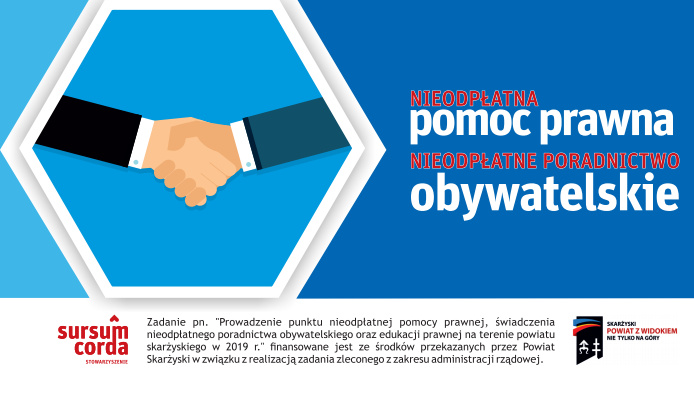 „Prowadzenie punktu nieodpłatnej pomocy prawnej, świadczenia nieodpłatnego poradnictwa obywatelskiego oraz edukacji prawnej na terenie powiatu skarżyskiego w 2019 r." finansowane jest ze środków przekazanych przez Powiat Skarżyski w związku z realizacją zadania zleconego z zakresu administracji rządowej.
