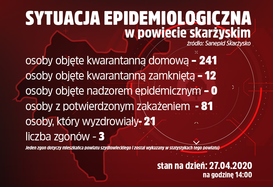 Sytuacja epidemiologiczna w powiecie skarżyskim (stan na dzień 27.04.2020, godz. 14.00), według danych Państwowego Powiatowego Inspektora Sanitarnego w Skarżysku-Kamiennej.