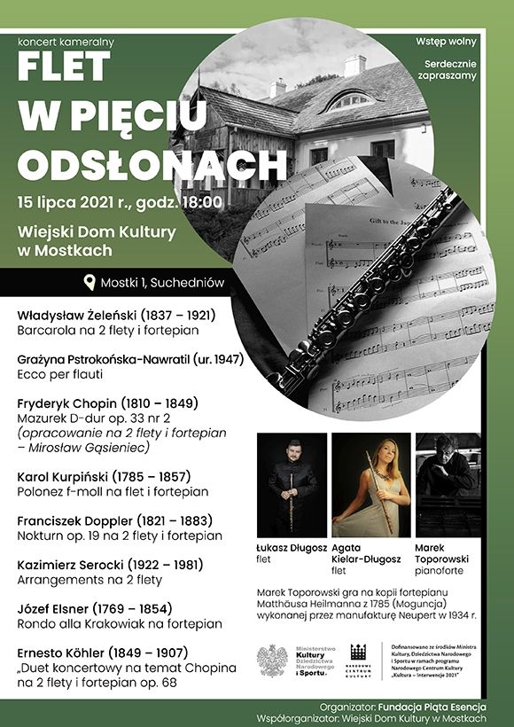Już w najbliższy czwartek w zabytkowym dworku Wiejskiego Domu Kultury w Mostkach czołowi polscy wykonawcy wystąpią z kameralnym repertuarem w oryginalnych aranżacjach na dwa flety i fortepian. Obok pochodzącego ze Skarżyska – Kamiennej światowej sławy flecisty Łukasza Długosza publiczność będzie mogła usłyszeć laureatkę licznych konkursów muzycznych, stypendystkę fundacji Yehudi Menuhina Agatę Kielar – Długosz oraz Marka Toporowskiego – wybitnego pedagoga, kolekcjonera historycznych instrumentów i wielokrotnego zdobywcy Nagrody Fryderyka.