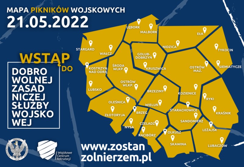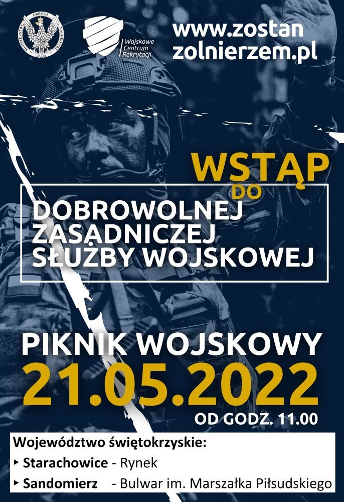 Wstąp do dobrowolnej zasadniczej służby wojskowej” – pod takim hasłem w sobotę 21 maja o godz. 11.00 rozpoczną się pikniki wojskowe w 32 miejscowościach. W województwie świętokrzyskim pikniki będą zlokalizowane w Sandomierzu i w Starachowicach. W Skarżysku-Kamiennej natomiast utworzony będzie mobilny punkt rekrutacyjny.