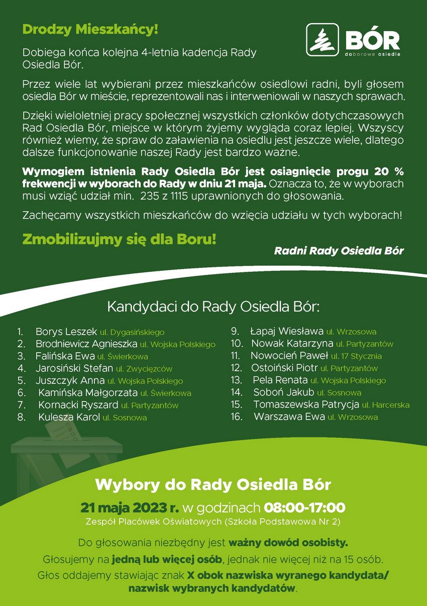 By wybory do Rady Osiedla Bór były ważne, w wyborach 21 maja musi wiziąć udział przynajmniej 20% mieszkańców (235) osiedla uprawnionych do głosowania.