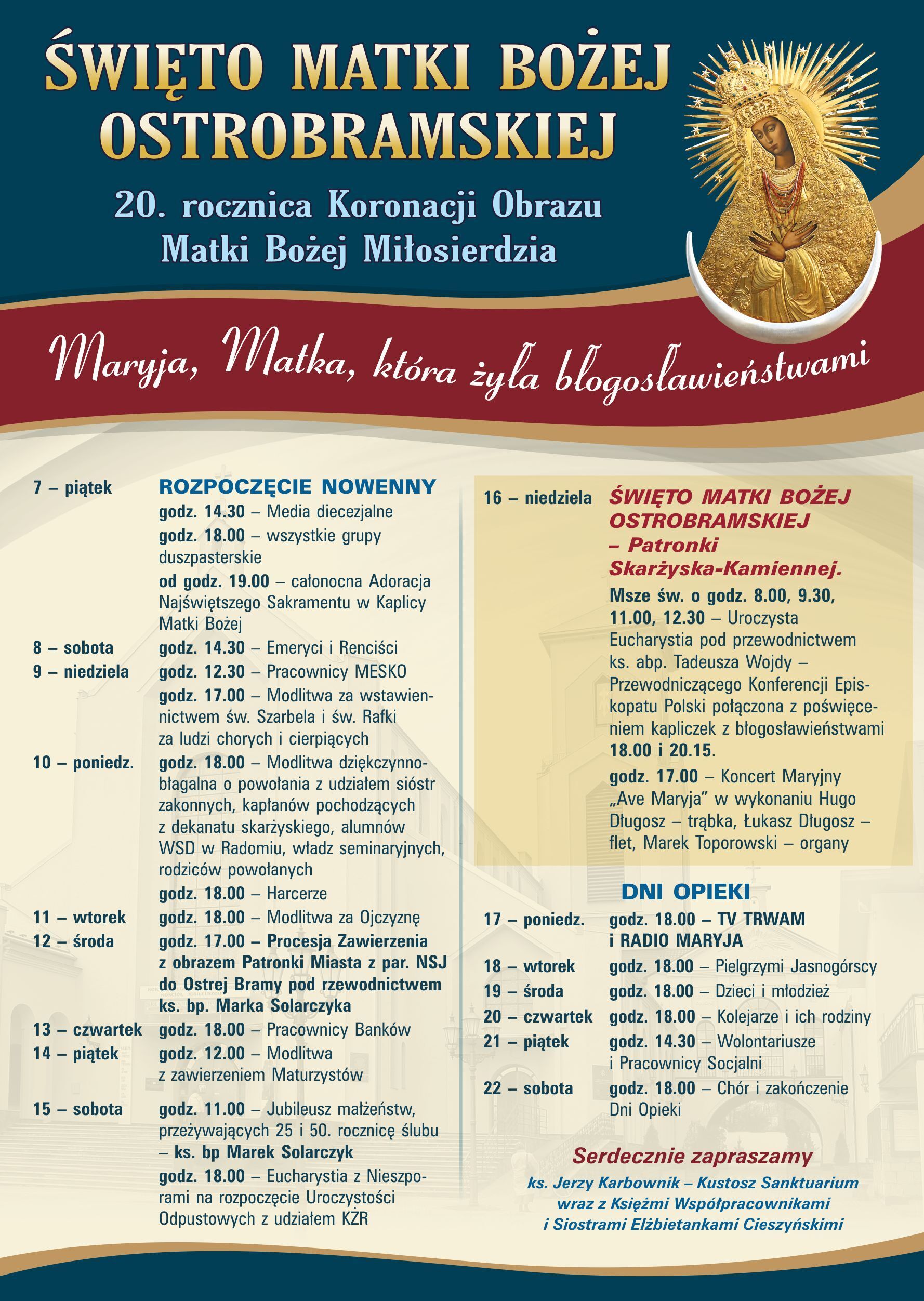 Sanktuarium Matki Bożej Ostrobramskiej w Skarżysku-Kamiennej zaprosza na obchody Święta Matki Bożej Ostrobramskiej, Patronki Skarżyska-Kamiennej. W dniach 7–22 listopada 2025 roku zapraszamy do wspólnej modlitwy, udziału w nowennie, procesjach i mszach świętych