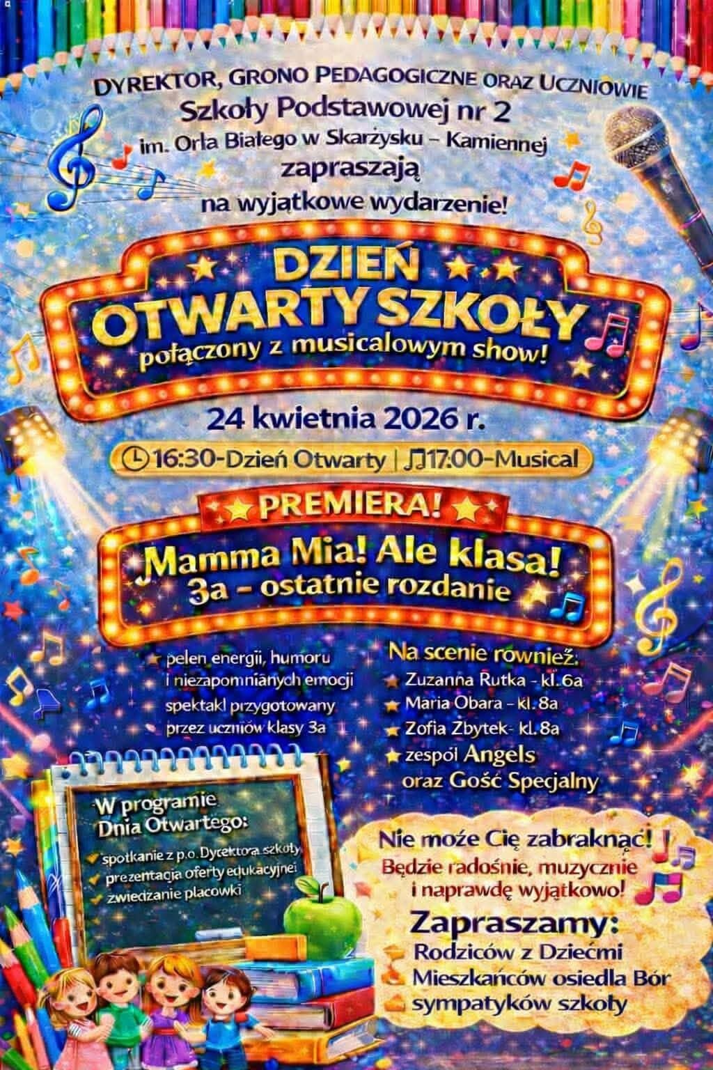 Wydarzenie rozpocznie się o godzinie 16:30. O 17:00 zaplanowano musical pt. „Mamma Mia! Ale klasa! 3a – ostatnie rozdanie”, przygotowany przez uczniów, który – obok funkcji artystycznej – stanie się także wyrazem solidarności i wsparcia.