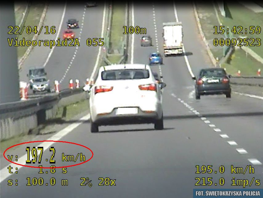 W miniony piątek policjanci z Wydziału Ruchu Drogowego skarżyskiej komendy pełnili służbę na trasie S-7 radiowozem wyposażonym w wideorejestrator. Około godziny 15:40 w miejscowości Łączna zauważyli szybko poruszający się pojazd marki Kia. Funkcjonariusze ruszyli za autem wykonując pomiar. Policyjny wideorejestrator wykazał, że kierowca auta znacznie przekroczył dozwoloną prędkość. Urządzenie zarejestrowało 197 km/h, w miejscu gdzie obowiązuje ograniczenie prędkości do 120 km/h.