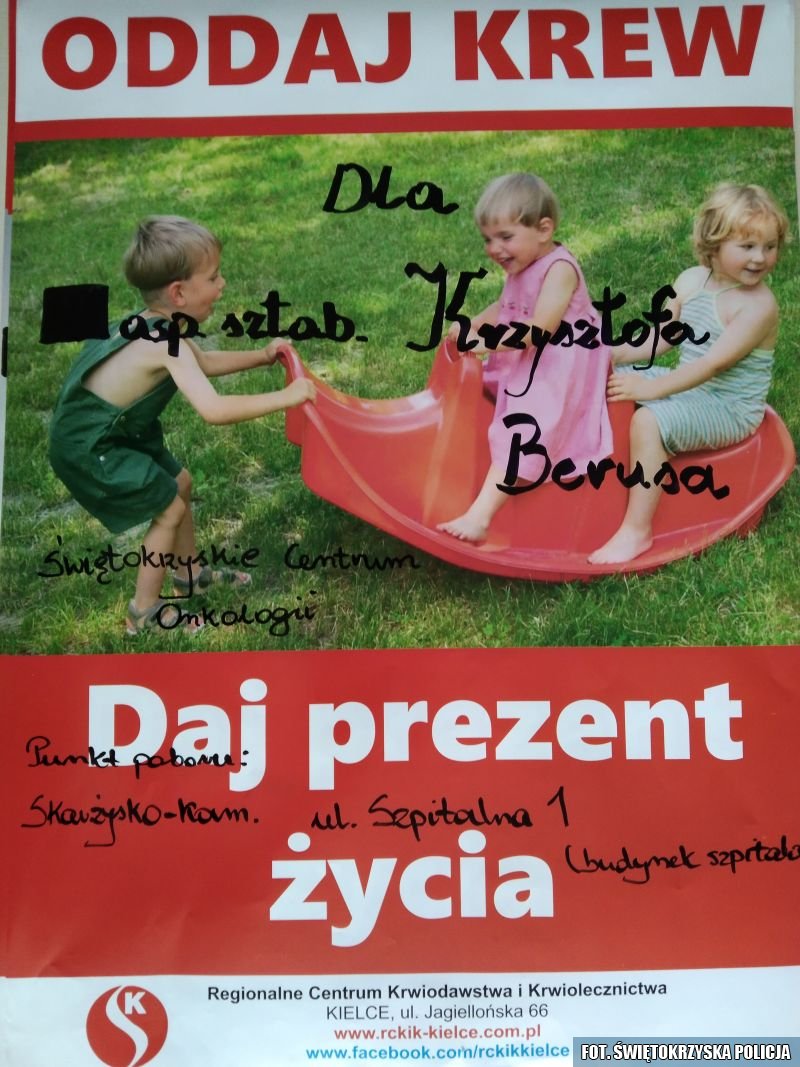 Asp. szt. Krzysztof Berus z Komisariatu Policji w Suchedniowie od przeszło 23 lat służy w Policji, od 15 lat jest dzielnicowym. Podczas codziennej służby zawsze stawał na straży prawa i pomagał innym w życiowych problemach. Nigdy nie przeszedł obojętnie obok potrzebujących pomocy. Za swoją aktywność, wiedzę i zaangażowanie niejednokrotnie dziękowali mu podopieczni ze służbowego rejonu. Dziś aspirant sam potrzebuje pomocy. Podstępna choroba zaatakowała nagle i niespodziewanie. Zwracamy się z prośbą o oddawanie krwi na rzecz potrzebującego policjanta, który aktualnie przebywa w szpitalu i potrzebuje najcenniejszego z lekarstw. Krew można oddawać w dowolnych oddziałach krwiodawstwa i krwiolecznictwa z dopiskiem „Dla Krzysztofa Berusa”.