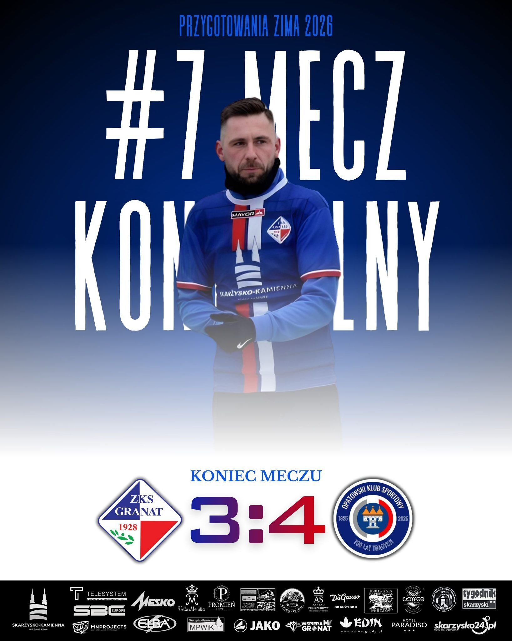 W sobotę, 28 lutego, piłkarze Granat Skarżysko rozegrali dodatkowy mecz kontrolny, który zastąpił odwołaną inaugurację rundy wiosennej w Rudkach. Rywalem podopiecznych Tomasza Wójtowicza był lider Klasy Okręgowej po rundzie jesiennej – OKS Opatów. Spotkanie odbyło się na sztucznym boisku w Łagowie i zakończyło się zwycięstwem piłkarzy z Opatowa 4:3.
